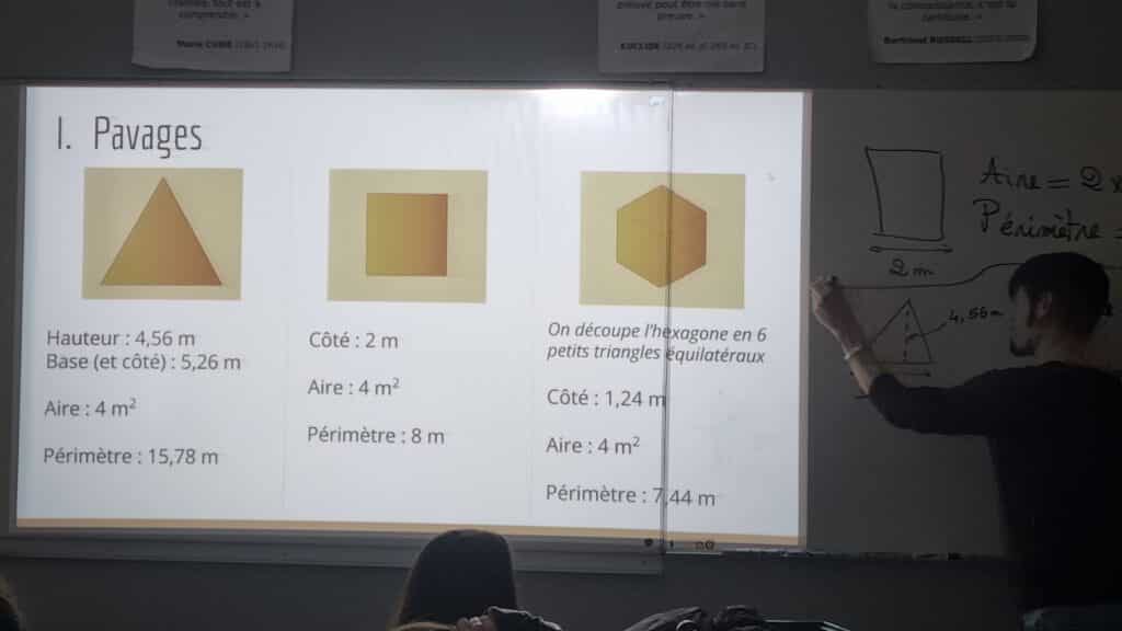 1 Les pavages, du carrelage basique aux figures bizarres, périodique, apériodique, régulier. On retrouve leurs usage dans les arts en mosaïque ou dans les vitraux. Trois manières pour faire un pavage sont évoquées : triangles équilatéraux, carrés, hexagones. Dans la démonstration faite ici, chaque figure possède une aire de 4m². Où l’on s’aperçoit que l’hexagone est la figure qui optimise le mieux l’espace.