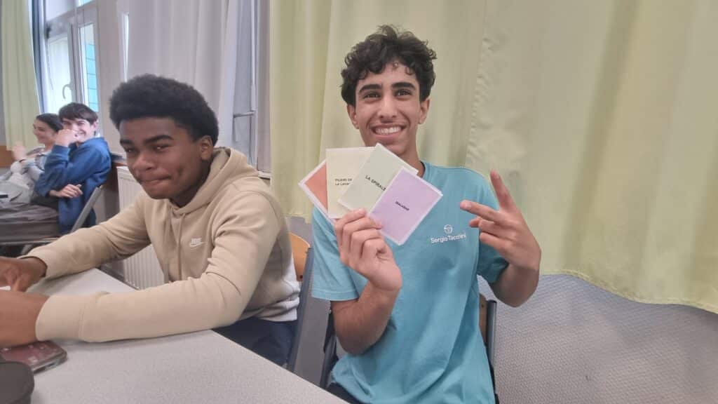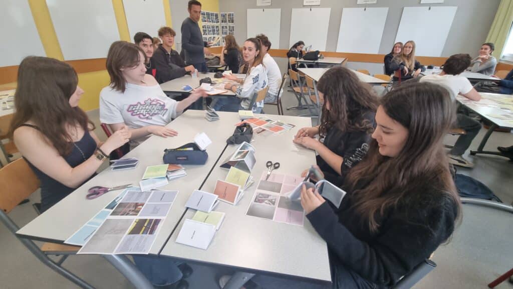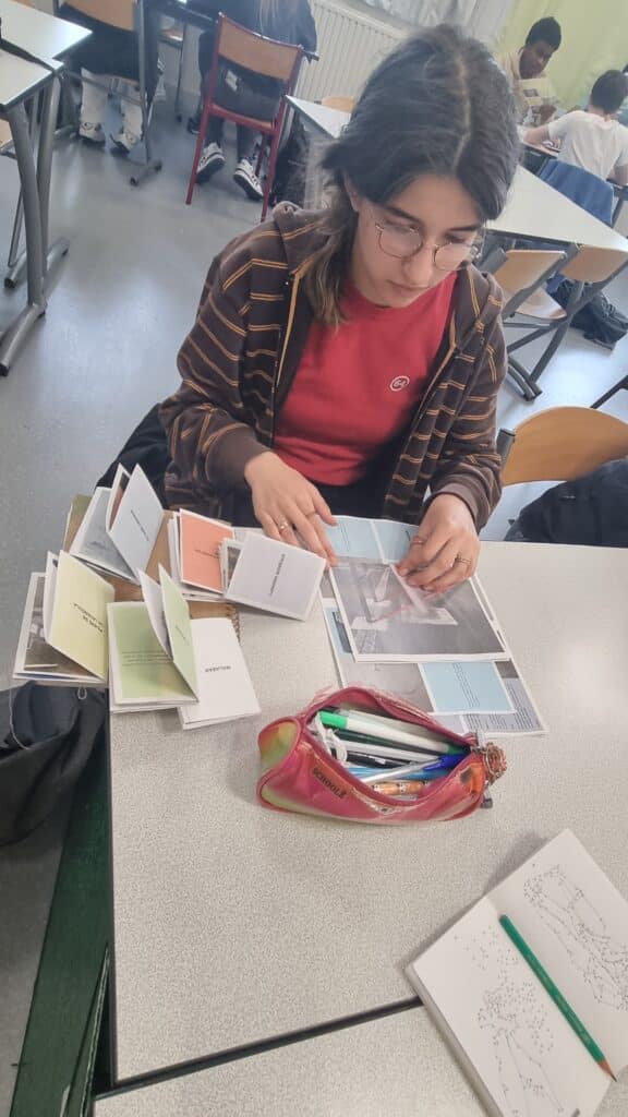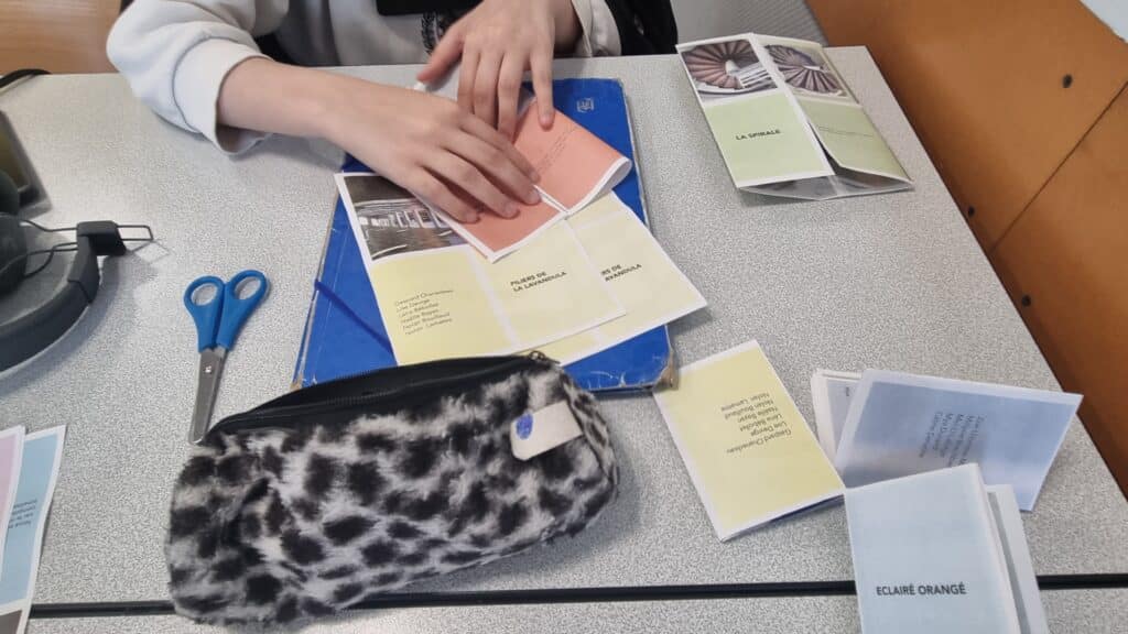 Finalement, la classe retient le support fanzine ainsi qu’un pliage simple mais efficace pour réaliser un mini livret modulable en poster.